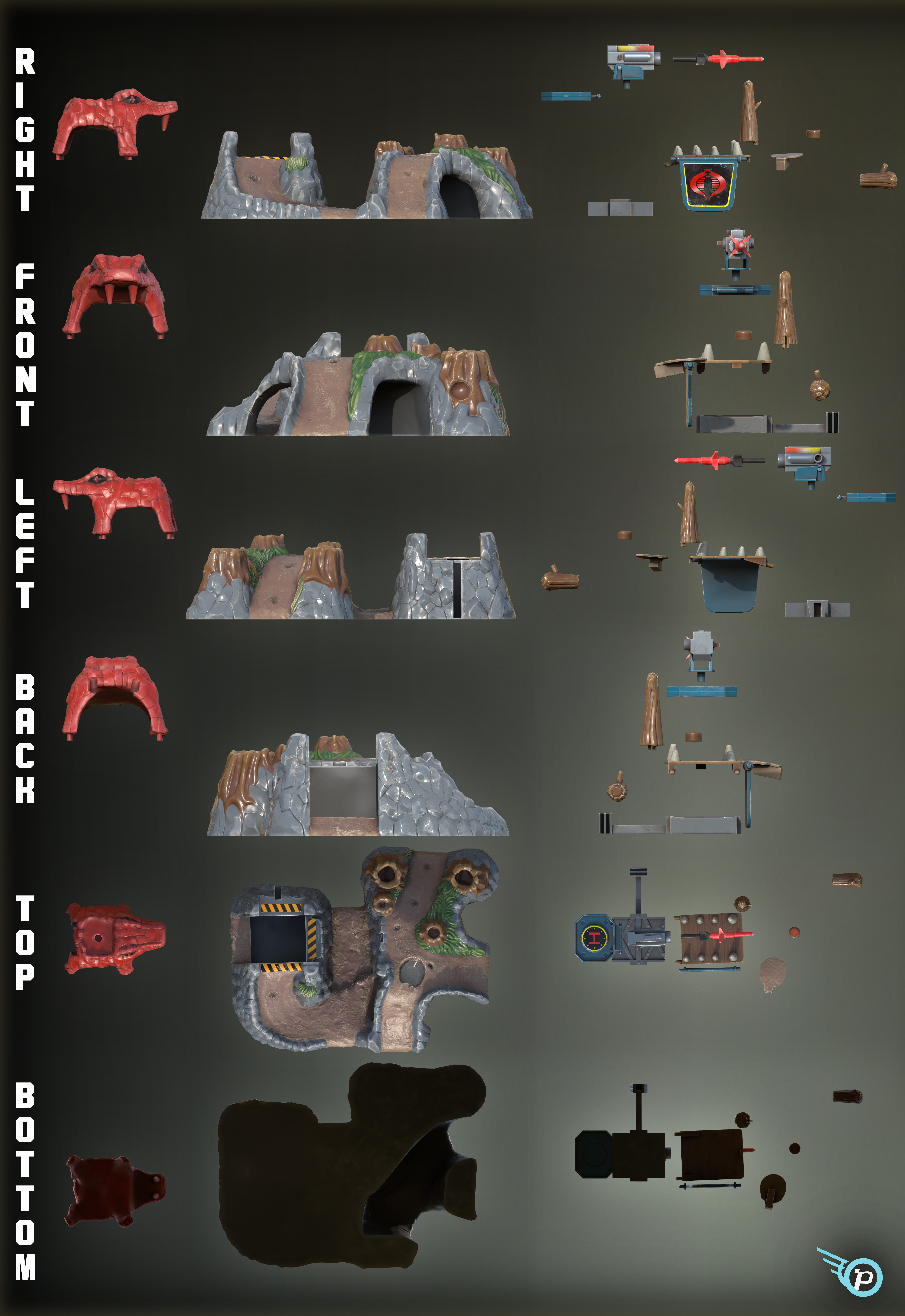 Here is a mashup I made of both the Viper Ambush and the Cobra Mountain Headquarters playsets by Hasbro. Combining the best elements of both Micro Machines and the G.I. Joe worlds. Also, a lot of TLC was put into creating texture maps of a more modern color palette, and emphasizing on dirt, grime, and wear to show signs that this playset has been played with, constantly.